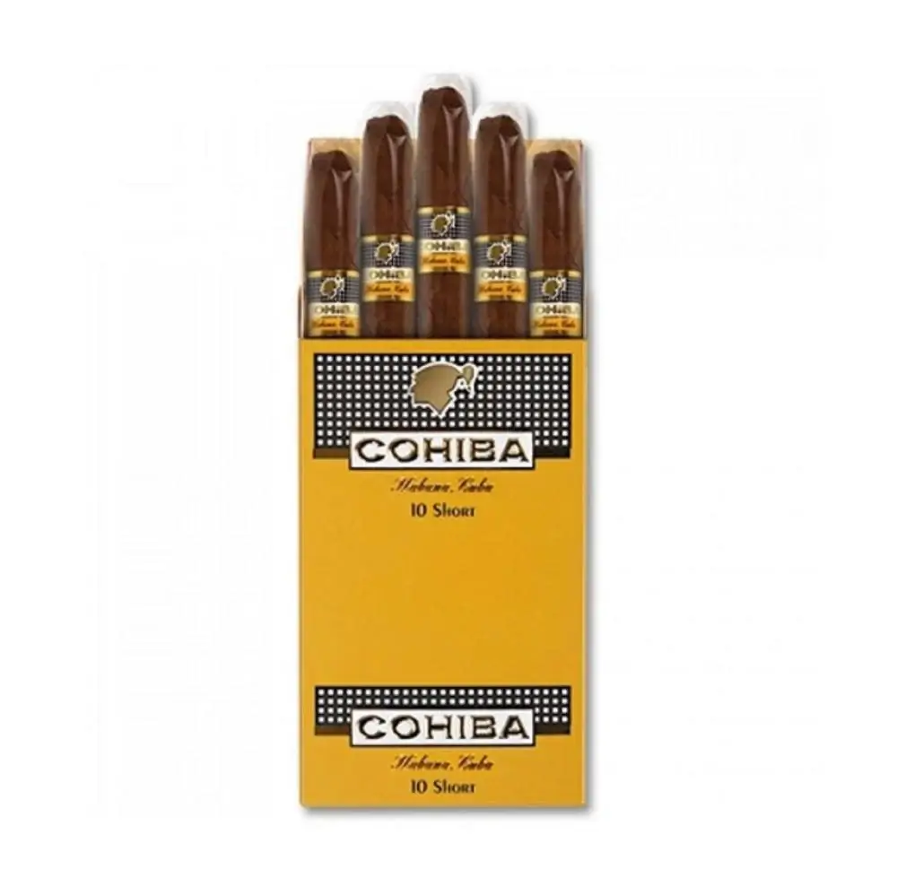 The Cohiba Short Pack of 10, 9 cm long, balanced and strong flavor, 10 pieces per box, 10–15 min smoking time per cigar.